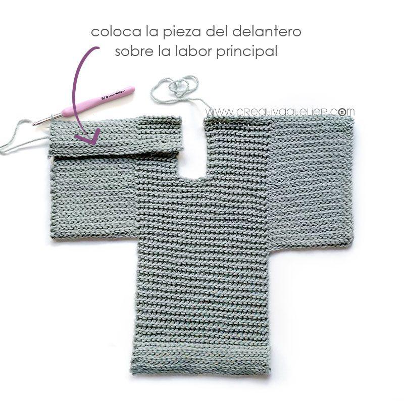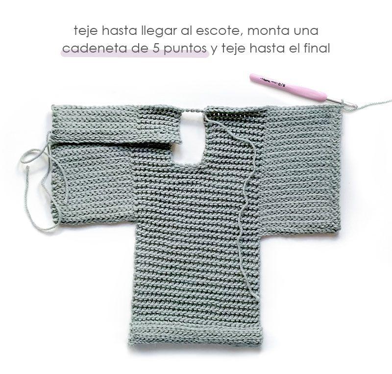 De este modo, deberíamos tener dos piezas de tejido, la mas pequeñita que acabamos de terminar con la hebra terminando en el lado izquierdo, y otra de mayor tamaño con la hebra terminando también en la mismo lado.Para unir las dos piezas continúa tejiendo con la hebra de la pieza del delantero del siguiente modo: 1 cad, 1 PE, 17 PE-delante, 9 PE-detrás. Al terminar, monta una cadeneta de 5 pts.
