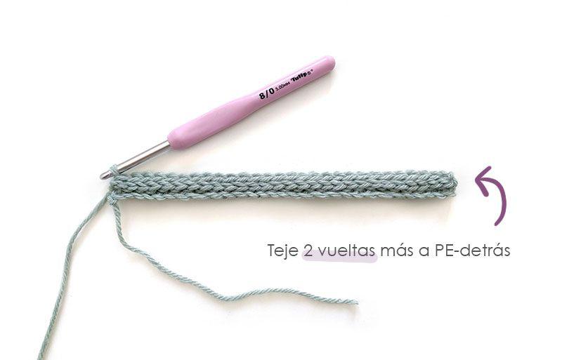 En la siguiente pasada, al llegar a la cadeneta de la vta anterior, deberás tejer 1 PE dentro de cada uno de los puntos.