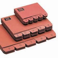 Para las tapas carton de alto gramaje en color craf .Los separadores y fichas son material de oficina. Seguramente muchas habreis visto unos cajones de color verde que dentro havia unos separadores de carton con el abecedario en la parte de arriba, que servian para ordenar por orden alfabetico las fichas de los clientes, ni mas ni menos que esto