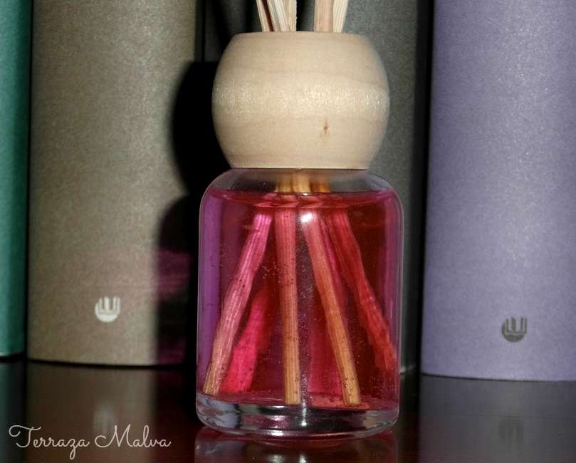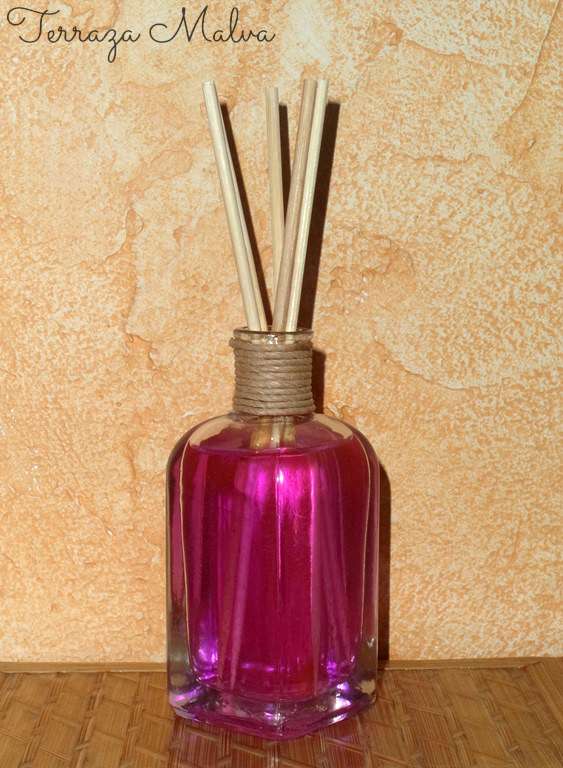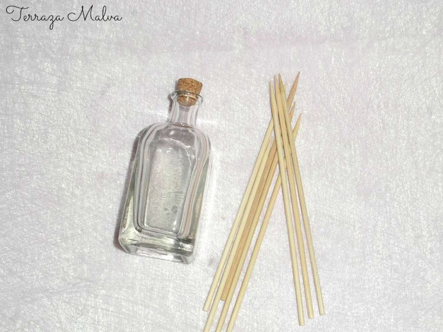 Mezclar el agua junto con el alcohol y el aceite esencial. Agregar unas gotas de colorante para jabones si se quiere. Poner la mezcla en el frasco de vidrio e introducir unos palitos de madera cortados a la medida deseada, de forma que ajusten a la boca del frasco.
