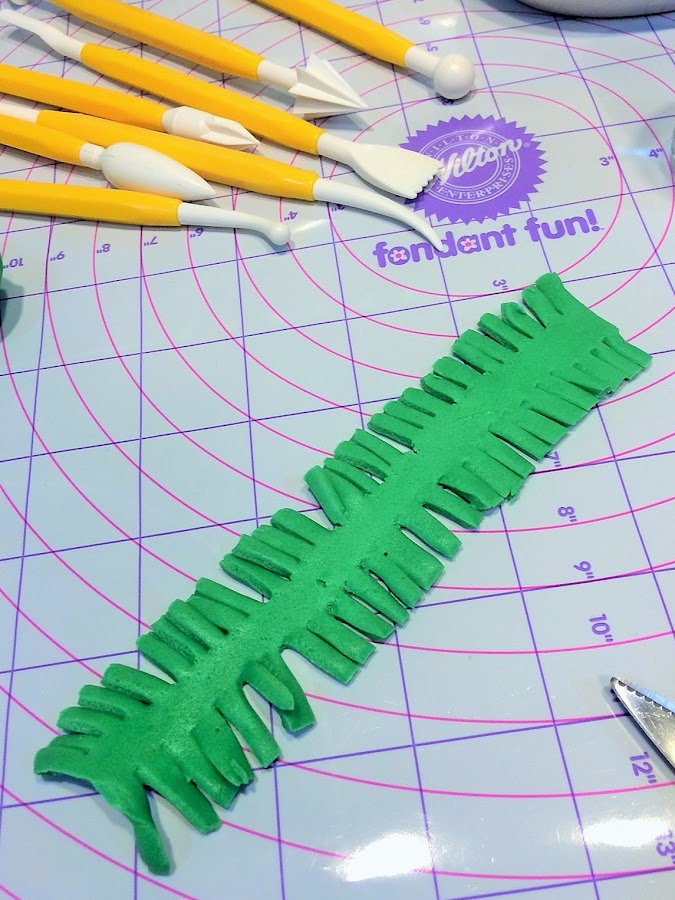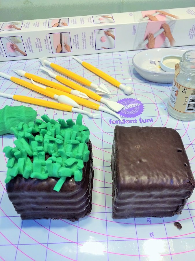 Para lograr el efecto "césped" corté tiras de fondant verde con las tijeras, haciendo tiritas a ambos lados. Luego las pegué sobre los cubos y doblé las tiritas hacia arriba.