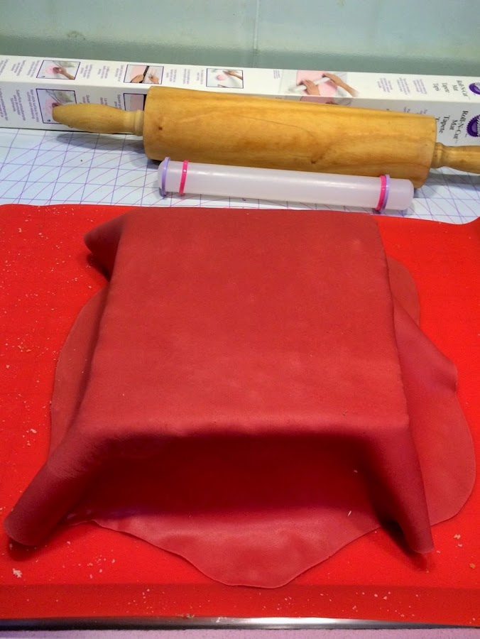 Ahora pasamos a lo más difícil. El CUBO de TNT. Lo cubrí de fondant rojo. Luego le añadí la banda blanca alrededor. En color negro corté las letras y el número 8. Todo está "pegado" con el pegamento que os digo. La idea de la "bomba" fue improvisación total je je. Aunque hoy mi rey me ha dicho que debería haber sido cuadrada ja ja ja.