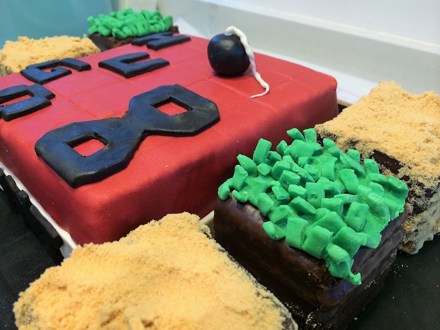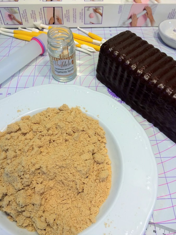 Para lograr los bloques de arena molí galletas en la thermomix y logré "pegarla" de la misma forma que el fondant. Con mi súper pegamento, je je. Si no tenéis, diluid azúcar en un poco de agua (que quede espesita) o también podéis ayudaros de mantequilla derretida.