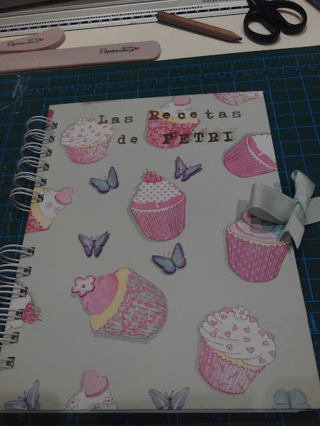 "Las Recetas de Petri" lleva un papel distinto, doble encuadernación de 6 agujeros y en vez de separador, puse cierre de lazo (Bellalunacrafts.com) Como adorno en la portada recorté mariposas, las entinté y también con pegamento de efecto 3D. Solo van pegadas el centro para dar sensación de que vuelan...
