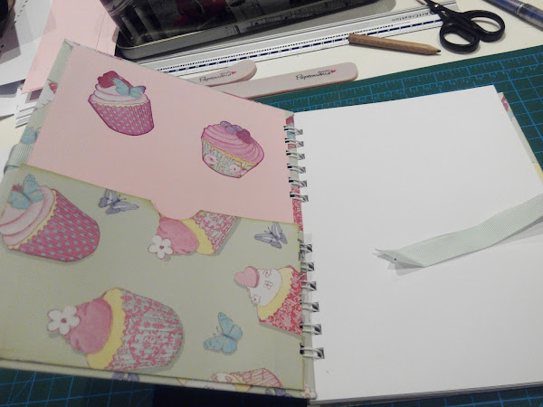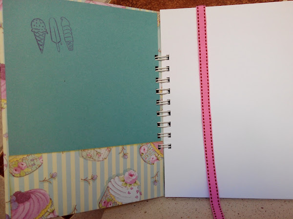 Por dentro en la contraportada hice un sobre grande de acordeón o de fuelle para los papeles sueltos y adornos con cupcakes recortados. Quedó muy bonita y espero que su dueña la esté usando.