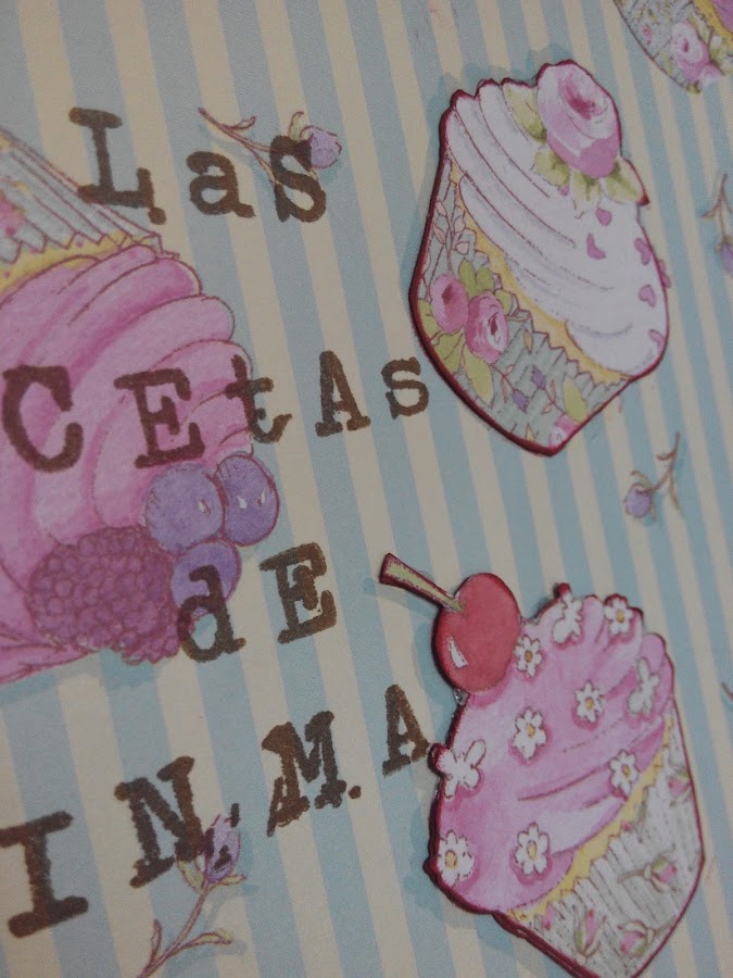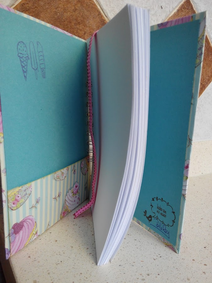Las medidas de los cartones (y del cuaderno claro) son 21 x 15.5 cm y lleva la encuadernación en el centro con 9 agujeros, Para adornar la portada, recorté varias figuras de cupcakes, entinté los bordes y pegué con pegamento Gloss 3D para darle un efecto de relieve.