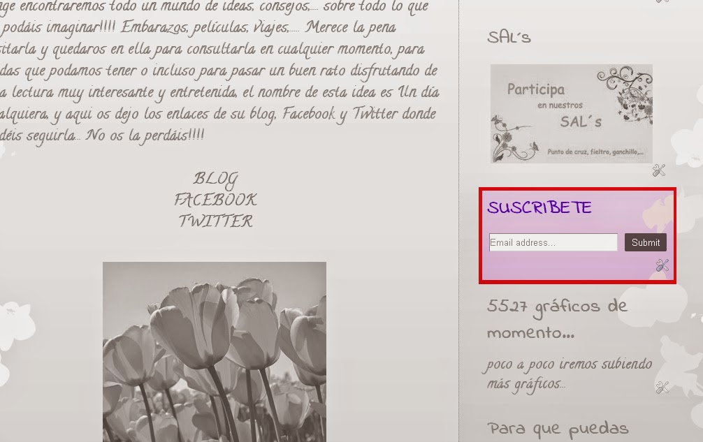 Si te suscribes a nuestro blog recibirás en tu correo todas la novedades de patrones, ideas, recetas, consejos,.... y mucho más, sólo tienes que insertar tu mail en el apartado que muestra la siguiente imagen y recibirás todas las novedades al instante de que se publiquen...