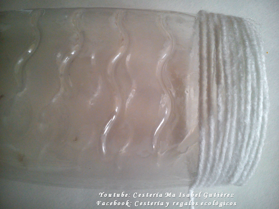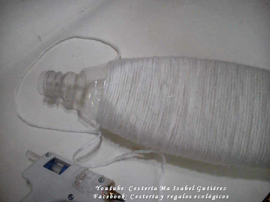 Empezamos a forrar el envase con estambre, pegando con silicón y empezando por la parte de abajo ...
