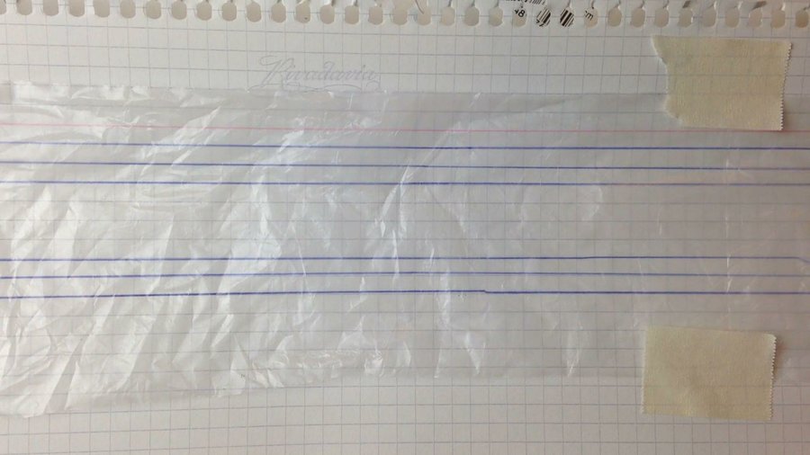 A este recorte le coloqué por encima un trozo de plástico transparente que sujeté con cinta de papel