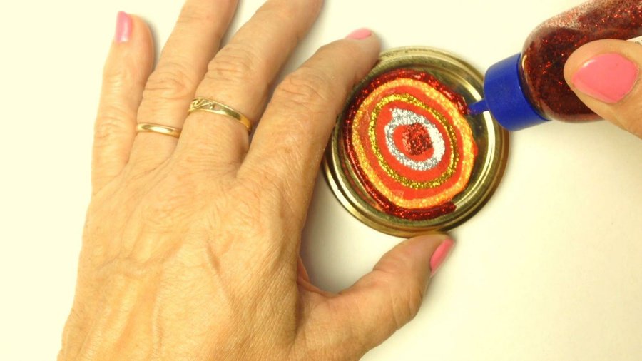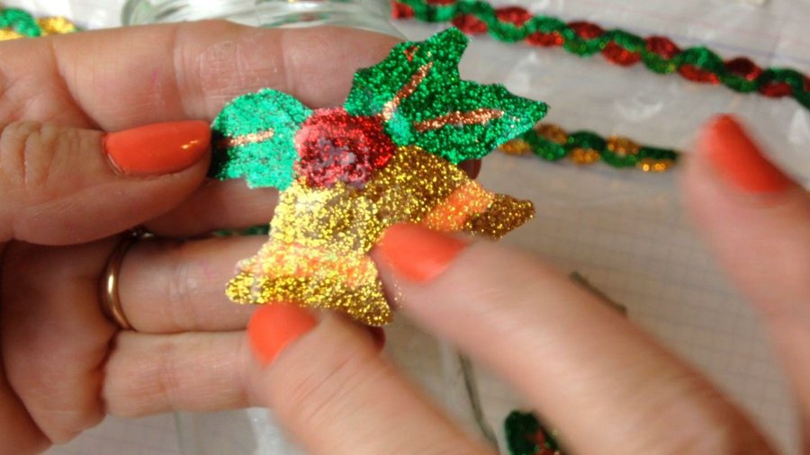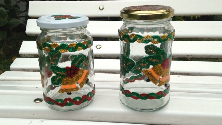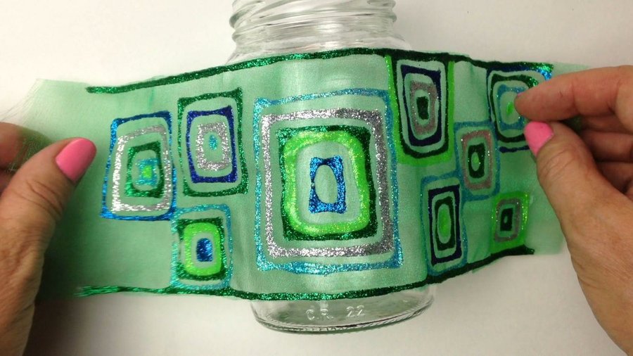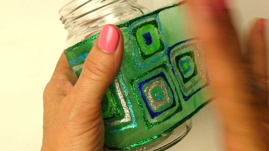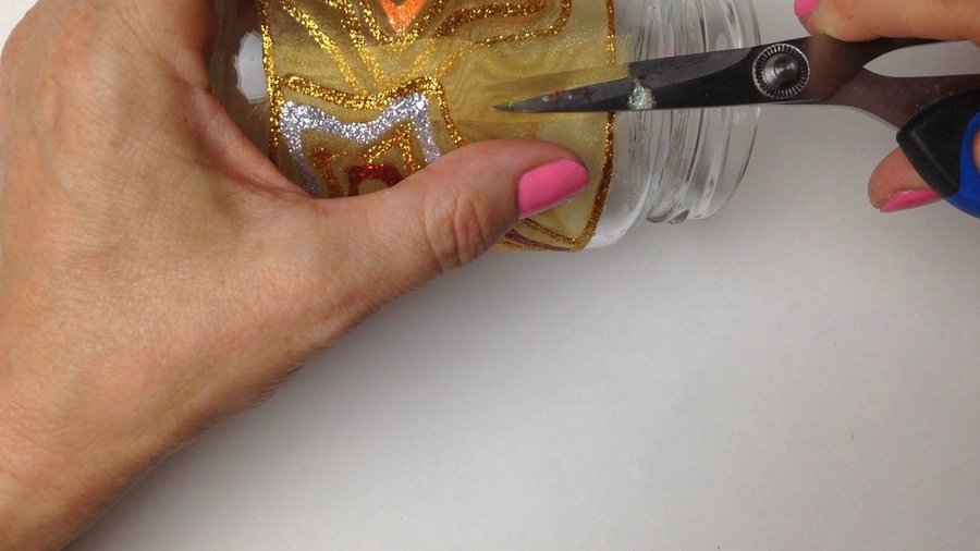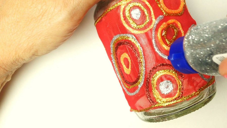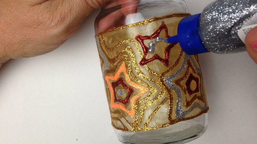Para terminar el frasco recorto la tela, pego lo que este aún despegado y luego disimilamos la unión realizando los mismos dibujos con el glitter y completo sobre la cinta si hiciera falta.
