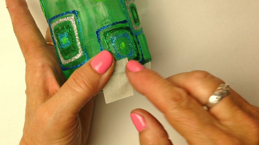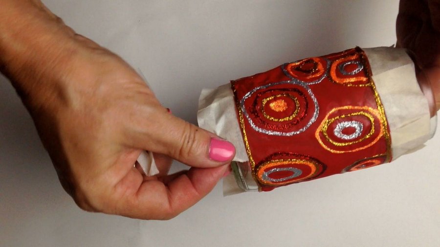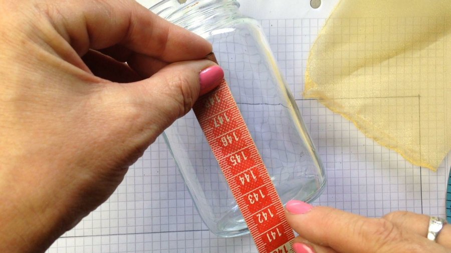 Una vez colocado el pegamento lo vamos a apoyar sobre el frasco, elegimos primero el centro, aplastamos con las manos y lo vamos girando hacia los costados. En la unión superponemos un poco la tela con pegamento y la sujetamos con cinta de papel y dejamos secar antes de recortar lo que sobra.
