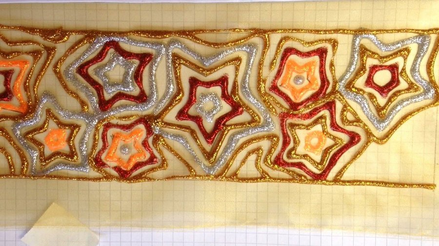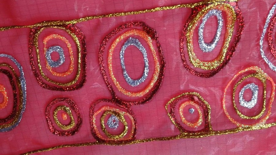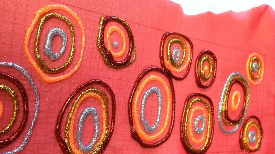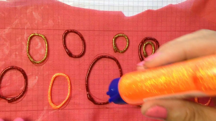 Cuando termine de hacer los óvalos le voy a hacer un borde a la tela, utilizo glitter dorado y lo aplico sobre el borde.