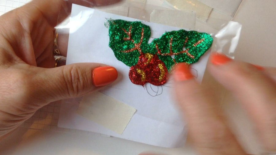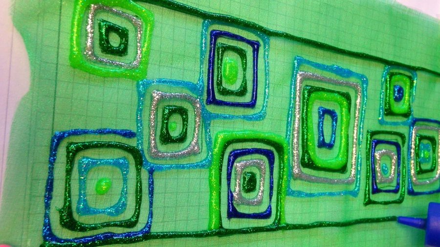 Aquí hice este otro diseño, son unos cuadrados. A éstos los realizo con otro color de tela y otros colores de glitter. También les realizo un borde de color verde.