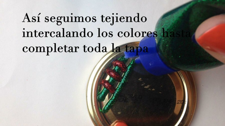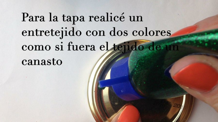 Para la tapa realicé en la parte superior un entretejido como si fuera una canasta, primero una línea y luego con otro color transversales, otra línea y transversales hasta completar.