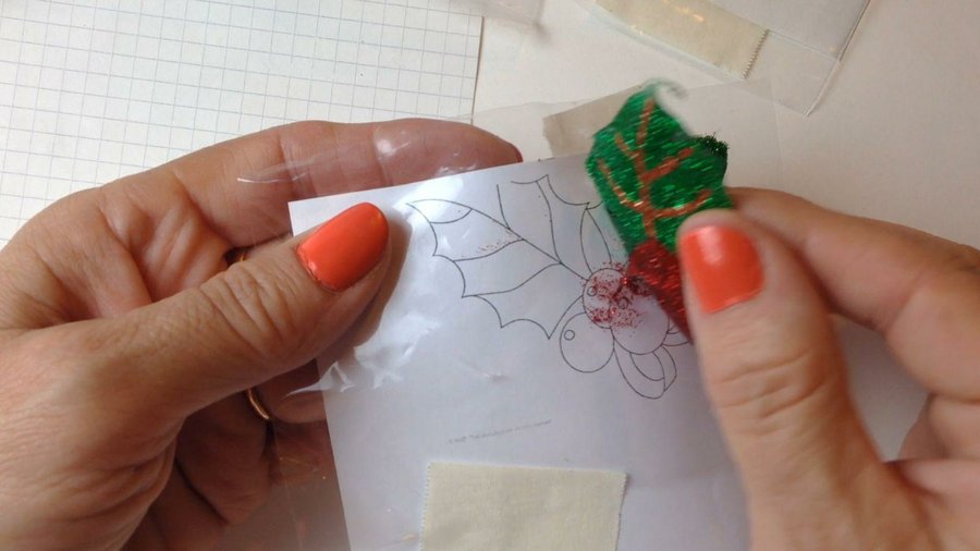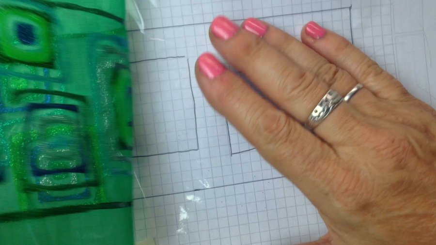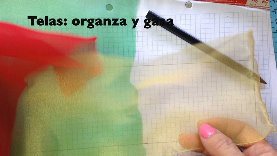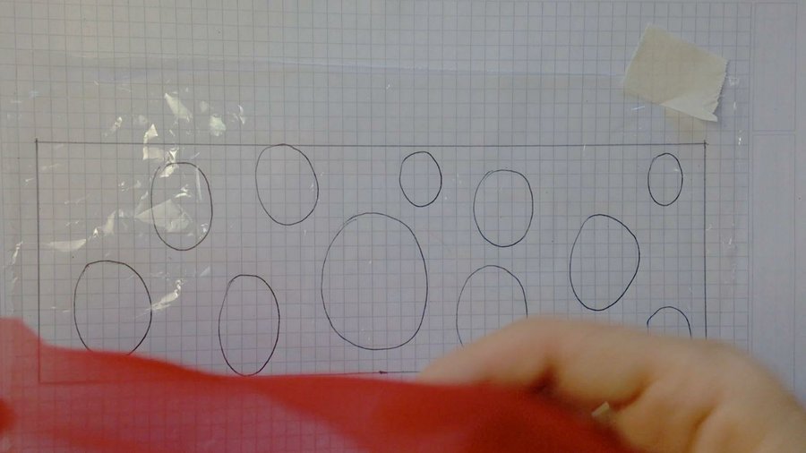 Luego por encima un plástico transparente que lo sujeto y sobre este plástico coloco la tela que como es transparente puedo ver los dibujos de fondo.