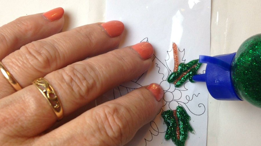 Elijo los colores de glitter, contorneando y dibujando. Intercalo los colores y relleno.