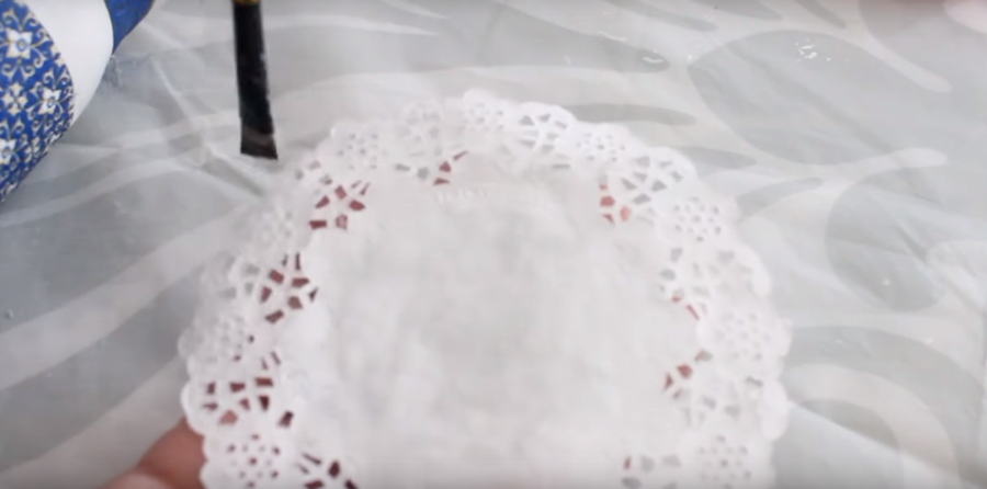 Ahora, hacemos el decoupage de la imagen seleccionada sobre una blonda de papel de las que se utilizan en repostería. Cubrimos con el mismo pegamento toda la superficie de la servilleta y de la blonda.