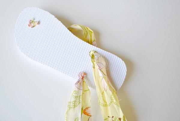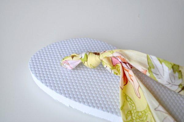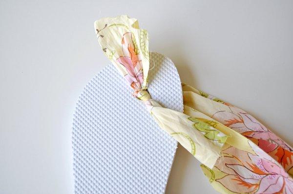 Da la vuelta a tus sandalias y realiza varios nudos con las dos telas. Estos van a ir entre los dedos. Mantén ambas tiras juntas para que queden igual de largas.