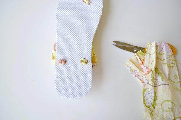 Empuja las correas de tus chanclas hasta que sobresalgan por el lado de la suela y córtalas con las tijeras de cocina para poder retirarlas.