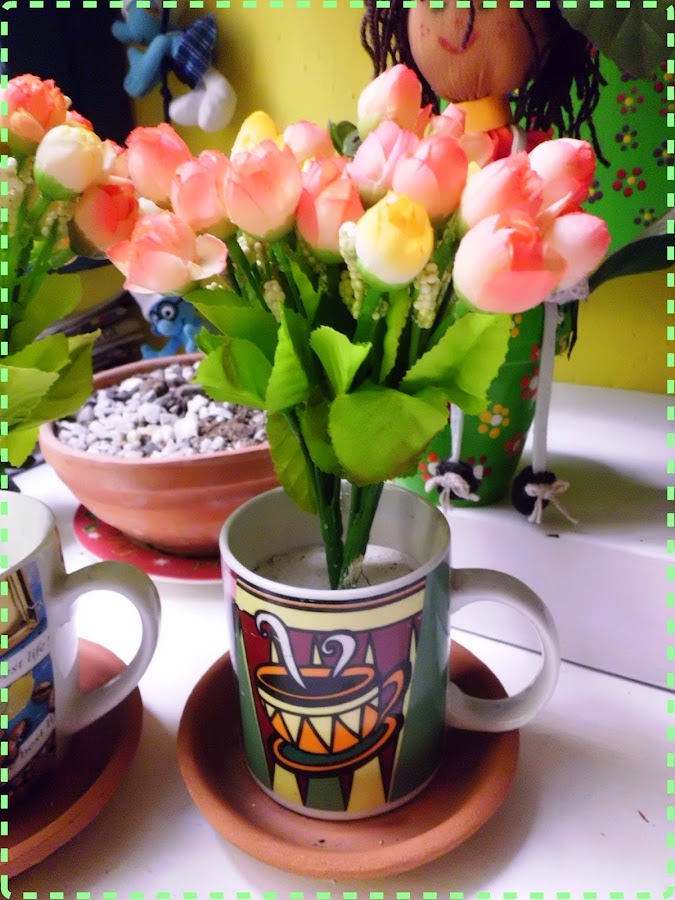Con unos guantes (ya que el cemento, al menos a mi, me reseca muchísimo las manos) se rellena la taza con la mezcla ya preparada y luego se insertan las flores (usé unos ramilletes de flores de tela)...