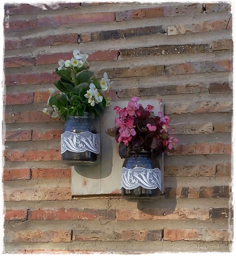 Hice unos pequeños agujeros,donde luego metería los extremos de los alambres que sujetarían los botes de cristal. Protegí la madera,con varias capas de barniz mate.