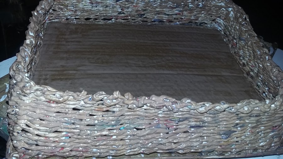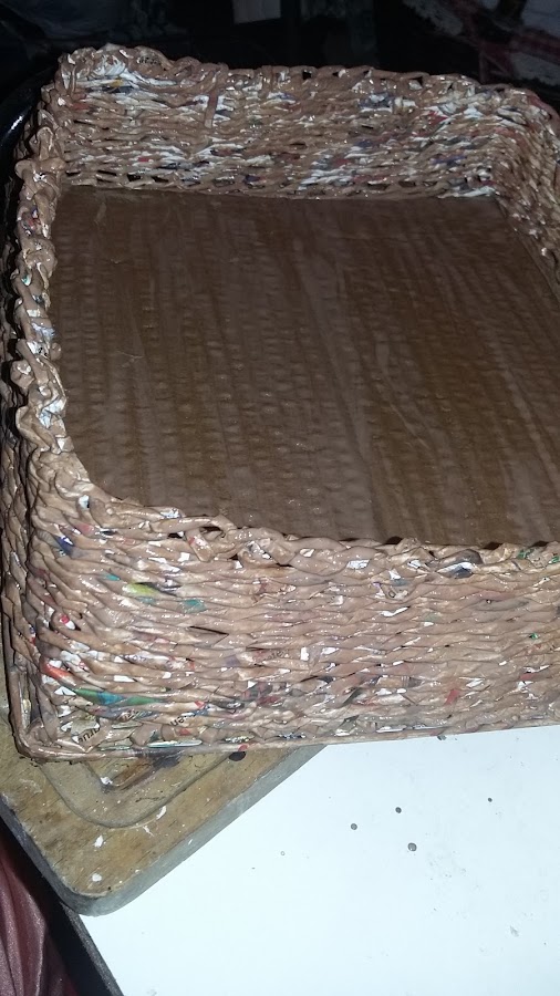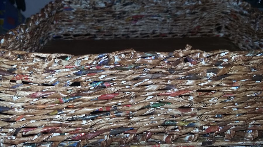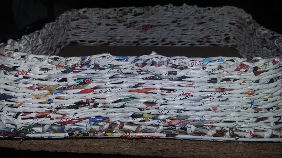 Siguiendo con el reciclado de papel, hice un canasto para mis esmaltes, usé un trozo de cartón que corté de una caja, y mucho papel de folletos de supermercado, que es satinado y se hacen rollitos mucho más lindos y finos que los de papel periódico.