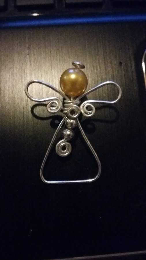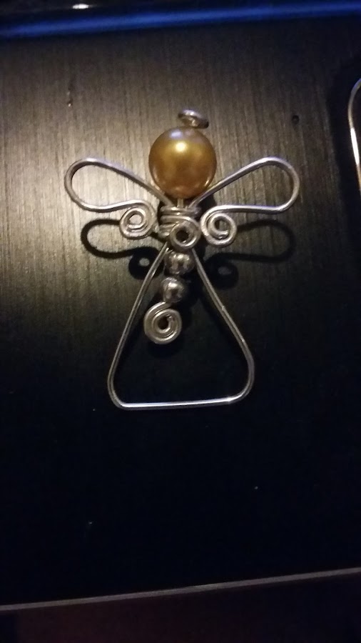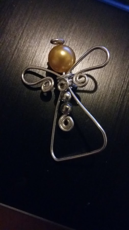 Ese angelito lo hice con alambre y una perlita de un antiguo collar. Tiene un enganche atrás para ponerle una cadenita y usarlo como dije, pero olvidé tomarle una foto de esa parte.