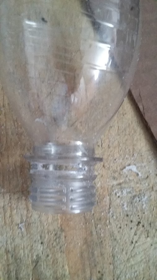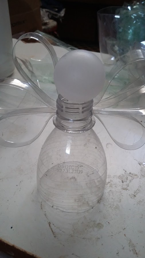 Para el cuerpo corté la parte superior de una botella de refresco. Le hice un corte en el pico, para calzar las alas allí y que se sostengan mejor.