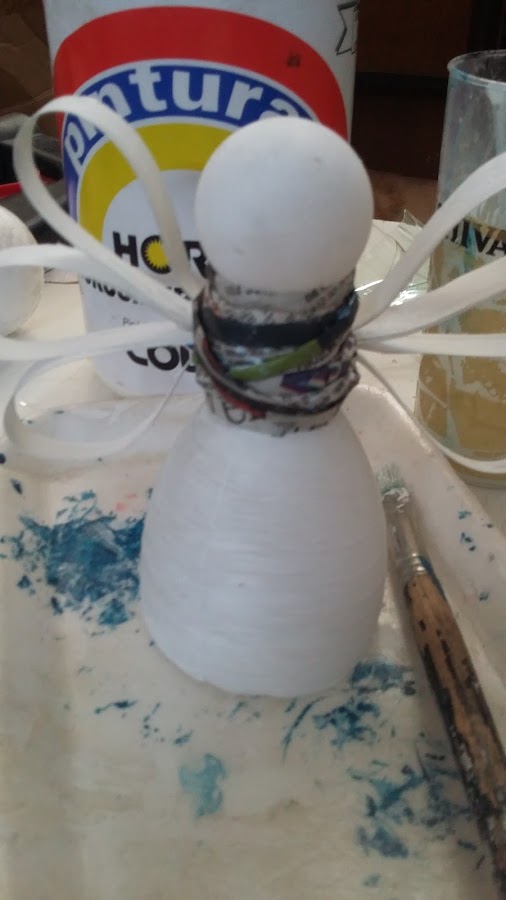 Después que todo estuvo bien seco, pinté en color piel la cabeza y le puse pelo con hilo de rafia, y manitas hechas con un trozo de cordel, pero esa foto no la tengo, jijiji.