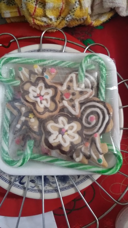 Para Navidad hice unas bandejitas de galletas de jengibre decoradas con glacé real y puse unos bastones de dulces, fue mi regalo para algunos amigos y familiares, ya que al estar sin empleo mi presupuesto es muy bajo.