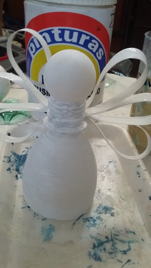 Hice otro angelito reciclando una botella de refresco y una bolita de un desodorante a rolón.
