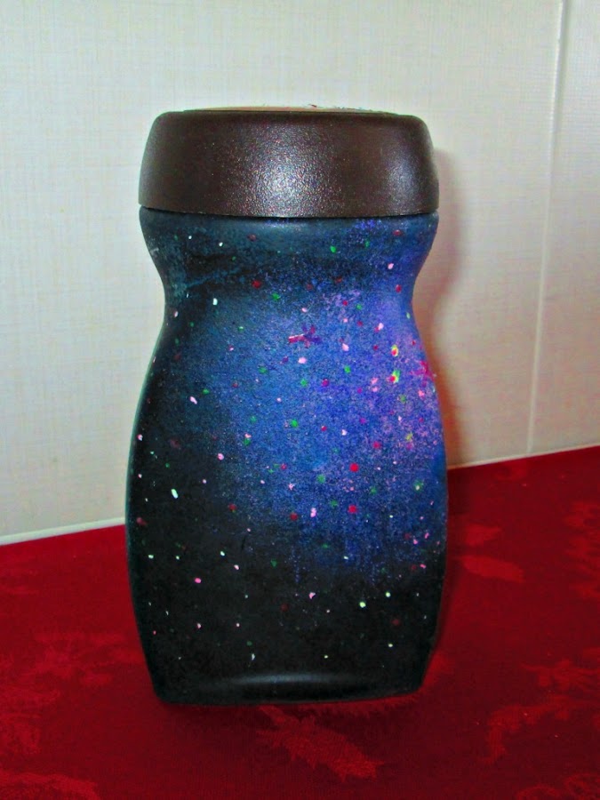 Esta vez, hemos reciclado un bote de cristal. Ha pasado de ser un simple bote de café, a una hucha para monedas (no sabéis lo que se ahorra así, si queréis un post, decídmelo en los comentarios) con diseño galáctico.