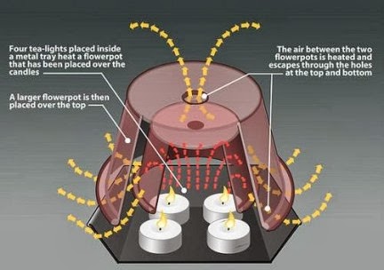 Las velas encendidas calientan el aire que hay dentro de las macetas. Como el calor tiende a ir hacia arriba, gracias a la creación de una corriente de convección entre el aire caliente y el aire frío, el aire caliente se escapa por el agujero central de la maceta más grande y por la parte de abajo de la bandeja, lo que hace que se caliente la habitación en la que se ha colocado este ingenioso DIY.Dylan Winter explica que para calentar una ?habitación normal? sólo hace falta encender cuatro velas a la vez. Cada vela puede estar encendida durante 4 horas. Entonces sólo habría que utilizar cuatro velas por la mañana y otras cuatro por la tarde para calentar las habitaciones en las que pasemos más tiempo. En el vídeo vemos que su ?habitación normal? es una habitación más o menos pequeña.De todas formas,hay que tener mucho cuidado con las velas, que son muy peligrosas y tienen que mantenerse bajo vigilancia.Aquí está el vídeo, tiene ya más de 3 millones de visitas. Nota: debajo de la bandeja coloca una revista,para que no se recaliente la base donde reposa el invento.