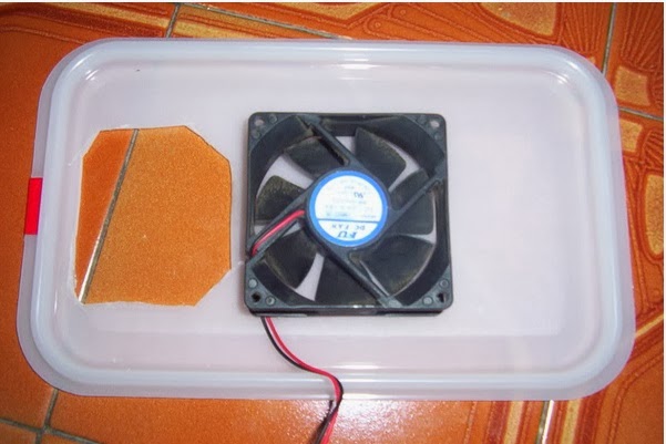 El ventilador debe ir bien fijado con silicona en la tapa del táper como se ve en la foto.La tela también se fija con silicona,ésta debe quedar cara abajo como se ve en la foto,de manera que las aspas no puedan rozar el tejido.