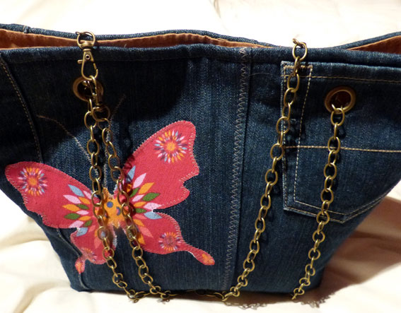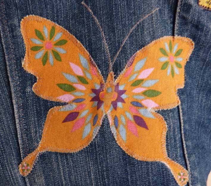 Recorté una mariposa de un tejido que tenía, previamente reforzado con fliselina, lo fijé a la tela con la plancha y lo cosí por todo su contorno con punto de zig zag.