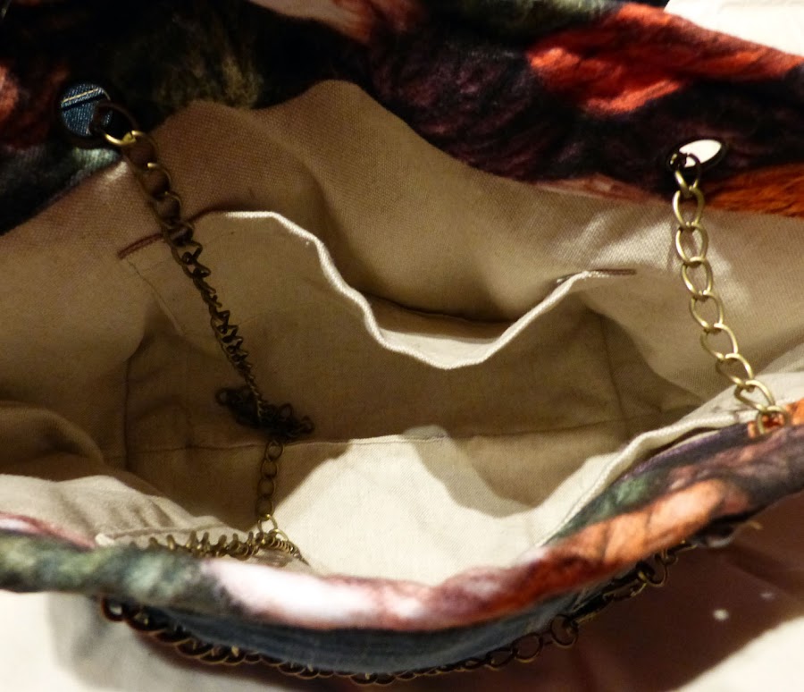 Lleva un asa de cadena pero después no me convenció y le puse un asa de cuero, porque me resulta mas cómodo de llevar.