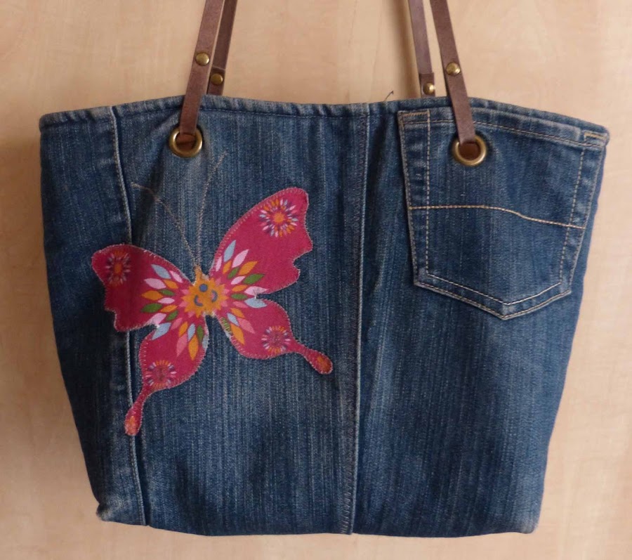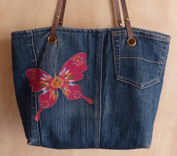 Para cada lado del bolso, recorté una mariposa de un tejido que tenía, previamente reforzado con fliselina, lo fijé a la tela con la plancha y lo cosí por todo su contorno con punto de zig zag.