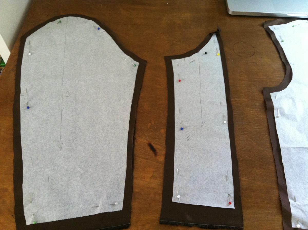 6.Posteriormente, sujetamos con cuidado con alfileres todos los trozos del patrón, y trazamos con precisión las medidas de las costuras con el jaboncillo. Las tijeras deberán seguir con cuidado esos trazados.