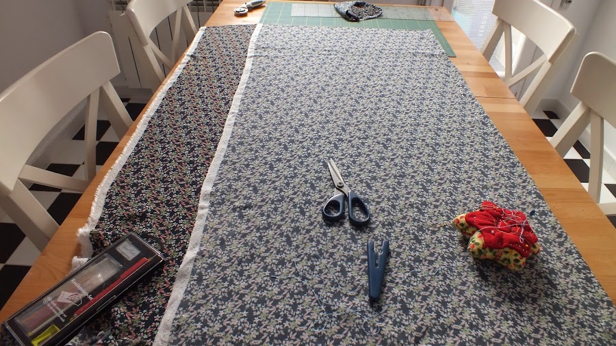 2.Primero extenderemos bien la tela sobre la mesa y la sujetaremos con alfileres. Doblamos la tela derecho con el derecho y el borde en su dirección. Si la tela tiene un sentido ascendente, indicarle sobre el revés con flechas, al jaboncillo.