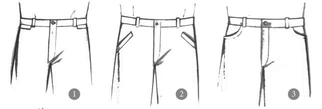 Bolsillos abiertos o de "corte": son los bolsillos que aprovechan una abertura natural de la prenda o del diseño para la entrada de los bolsillos.