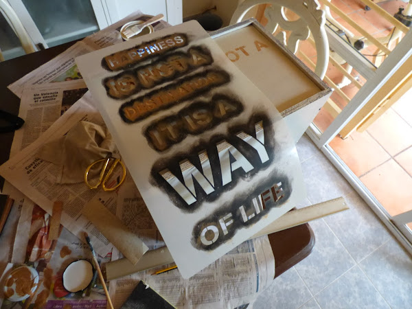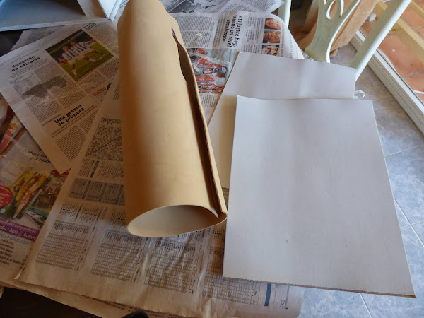 .......por encima de los papeles una pasadita de cola sin disolver que hará que se fijen mejor a la madera y ademas nos permitirá borrar los estarcidos si nos equivocamos en algo. Si no tuviera la cola o barniz, la pintura del estarcido penetraría en el papel y ya no habría vuelta atrás en caso de error....