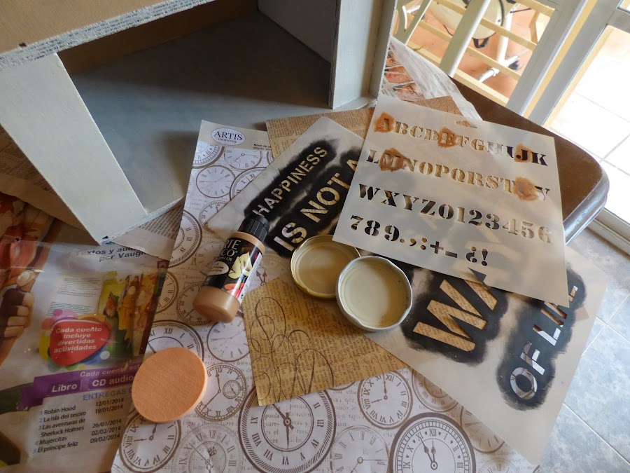 Cosas que voy a utilizar: plantillas de estarcido , cola, pintura acrilica, esponja para los estarcidos, tapitas de tarros de cristal para poner la pintura, papel decoupage de relojes, un retal de otro con textos amarillentos y un resto de papel pintado de color e imitación al lino