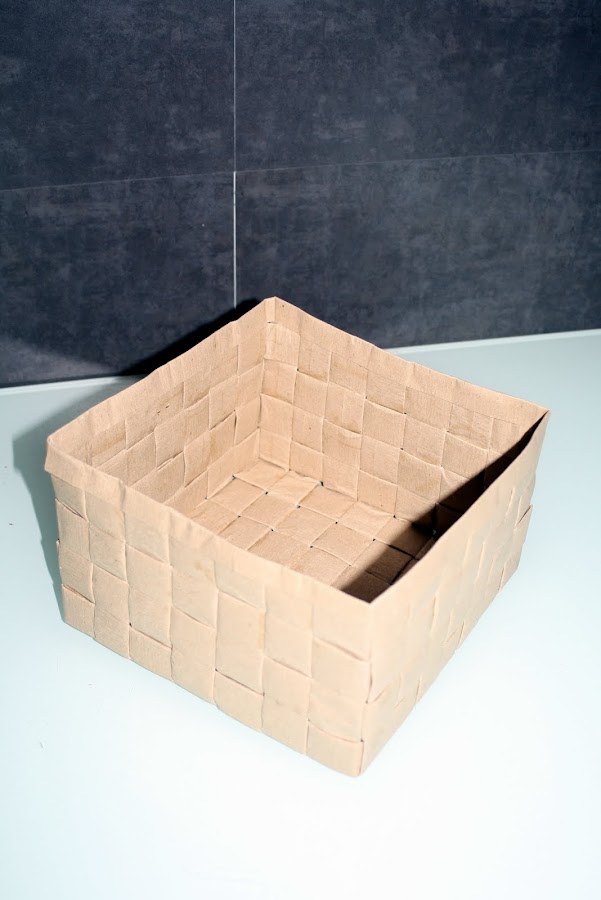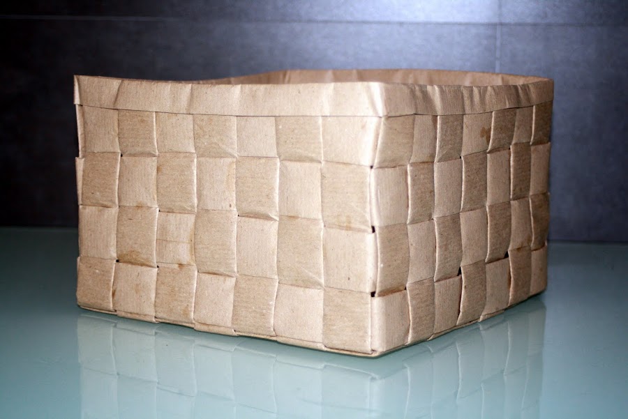 Se trata de una cesta realizada con papel, mediante el sistema del trenzado. Descubrí cómo se podían hacer cestas reciclando papel en un vídeo explicativo (http://www.youtube.com/watch?v=7TpP61LJ7Qo), en el que empleaban papel de periódico para su realización. Inmediatamente me picó el gusanillo y comencé a recopilar periódicos viejos para algún día probar a hacerlo. El coste de este trabajo es prácticamente cero, ya que ni siquiera los periódicos me costaron nada: usé periódicos gratuitos de los que reparten por las mañanas en las calles.