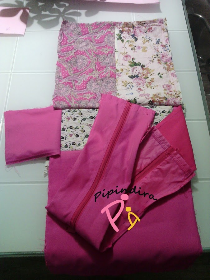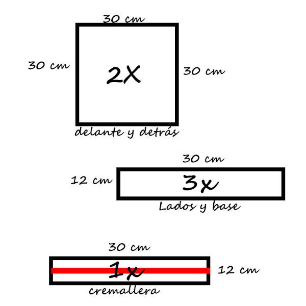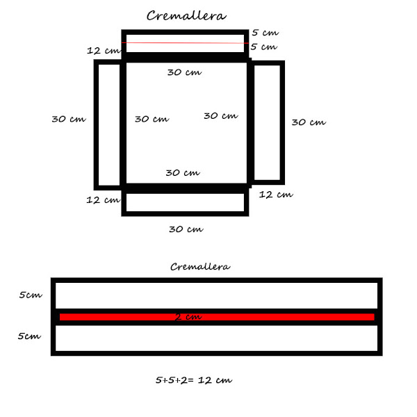 La parte de arriba de la cremallera la dejé como estaba. Es decir, la cremallera no la descosí, la dejé cosida a la tira en la que veía y descosí la tira entera. La idea era hacer 2 cuadros de 30cm x 30 cm. Luego 4 tiras, 2 para los lados ( de 30 x 12 cm), 1 para la base (de 30 x 12 cm), y otra para arriba (de 30 x 12 cm que es la que ya tiene la cremallera cosida).