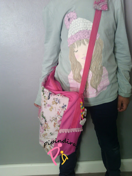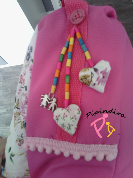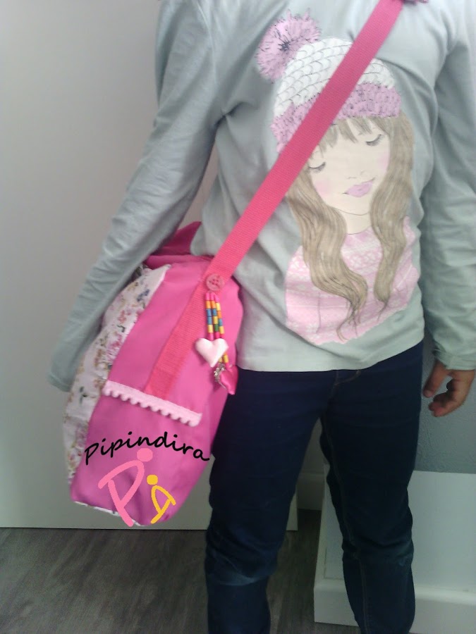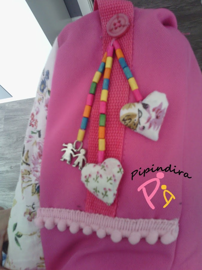 ¡ Y eso es todo amigos! Por dentro lleva un forro de tela de raso fucsia que tenía guardada de un disfraz (aquí hay de todo) de las mismas medidas que la mochila. Y en el hombro una de las tiras acolchadas que traía la mochila forrada de tela y cosida a las tiras fucsias.