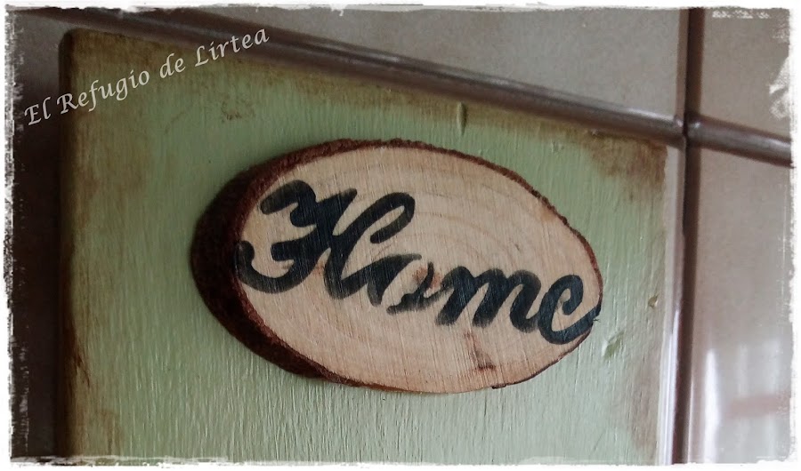 Sobre una pequeña corteza de madera ( que gane en uno de los retos de Anna) pongo la palabra Home y la pego sobre la tabla. ( si lo sé,debería de haber puesto "Casa" pero confieso que Home me parece más internacional y que todo el mundo sabe lo que significa...)