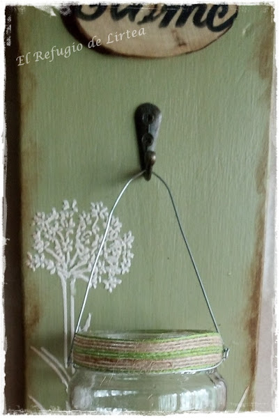Simplemente es un trozo de madera que lije y pinte con pintura tipo chalky en color verde, luego le di una capa de cera blanca y realicé unos stencil en relieve.