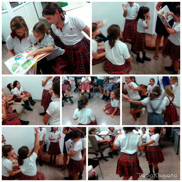 Después, como eran muchas y faltó MªCarmen, la cuenta cuentos (su madre está ingresada) hicimos grupos. Unas jugaron a las películas con mímica, otras a las adivinanzas y otras cantaron y bailaron en corro.