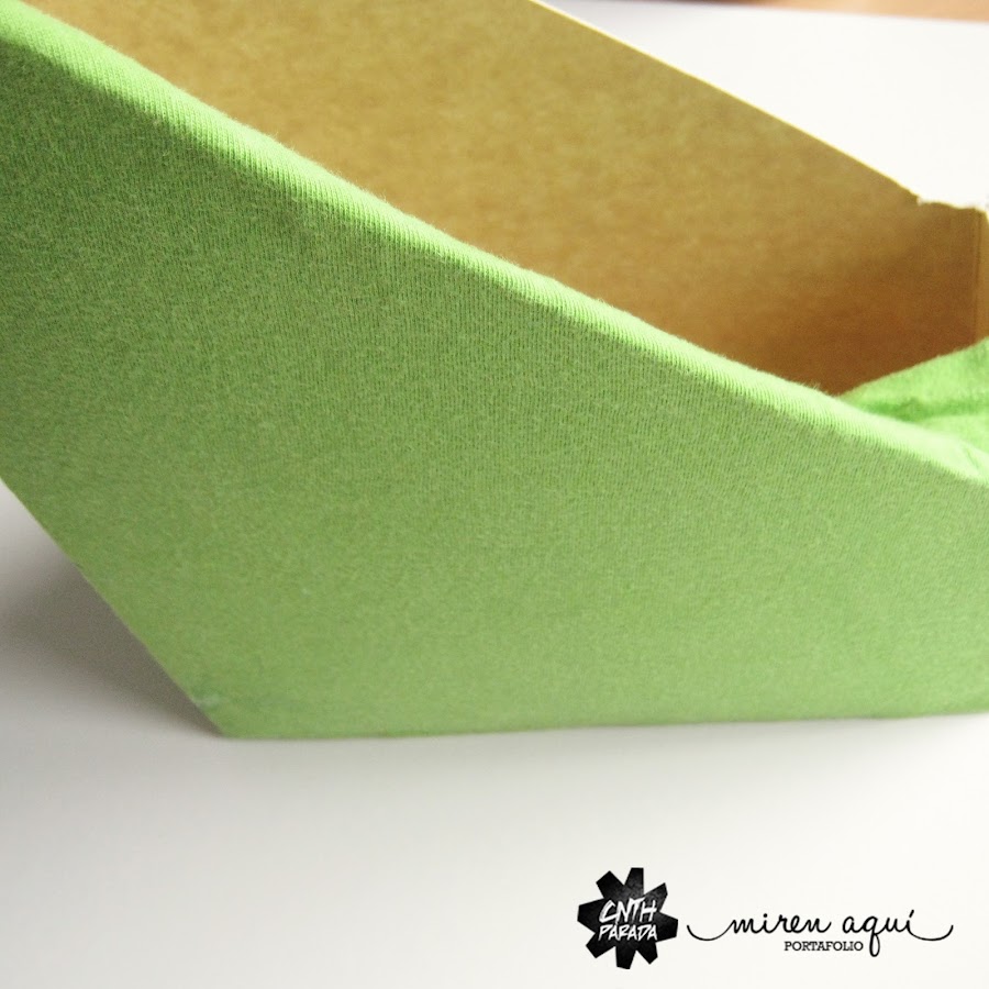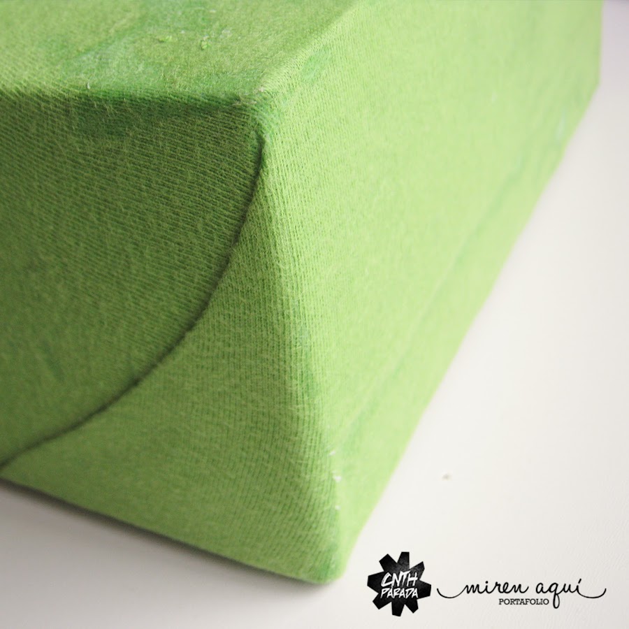 extender la tela sin exagerar para que no quede demasiado tirante ni muy suelta sobre el cartón, esperar un momento y seguir con las otras caras. La plancha se ocupa en las esquinas que debamos aplicar doblez de tela para asegurar que quede bien pegada y lisa.