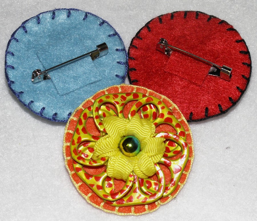 A continuación hice varias combinaciones de colores para crear tres modelos diferentes de broches, pero en todos ellos cubrí la parte de atrás con fieltro y lo ribetee con punto festón, y así hacer una acabado mas bonito.